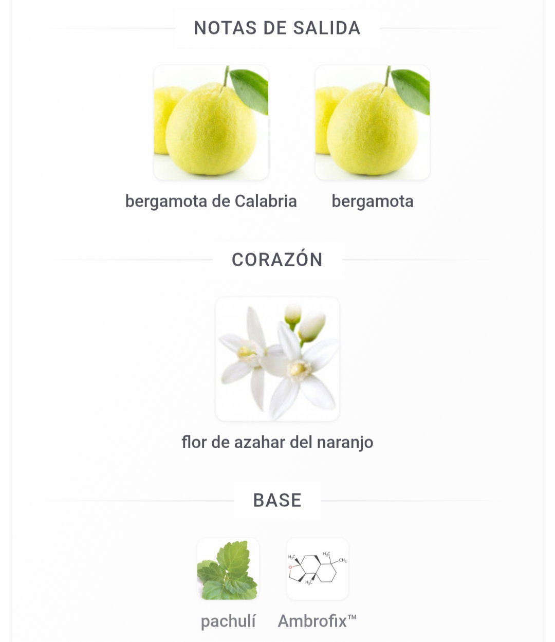 • Salida: Bergamota de Calabria y bergamota verde, que aportan una apertura vibrante y cítrica.