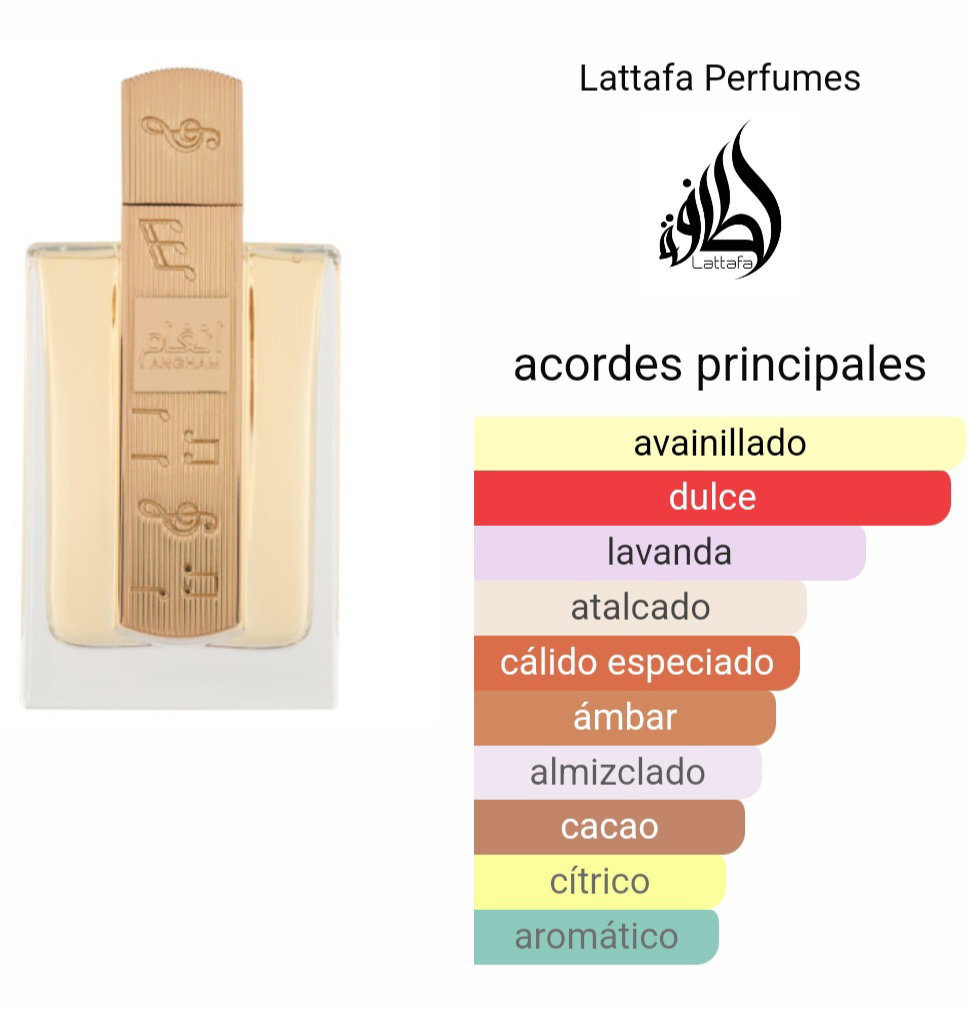 ✨️ Angham de Lattafa Perfumes es una fragancia de la familia olfativa Oriental Vainilla para Mujeres.