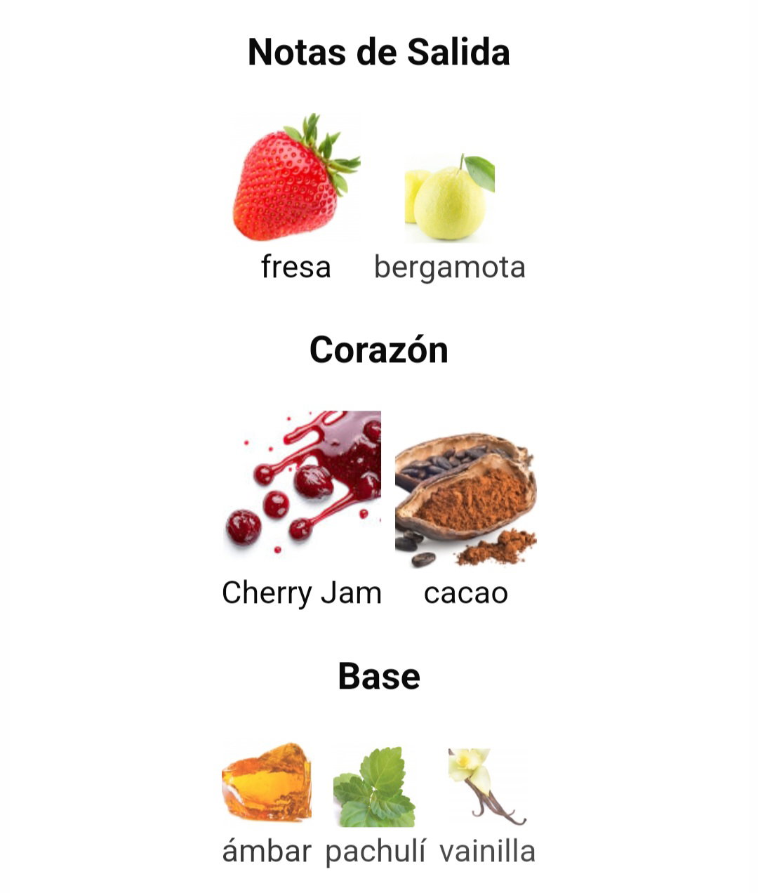 🍒 Notas de Fondo: ámbar, pachulí y vainilla.