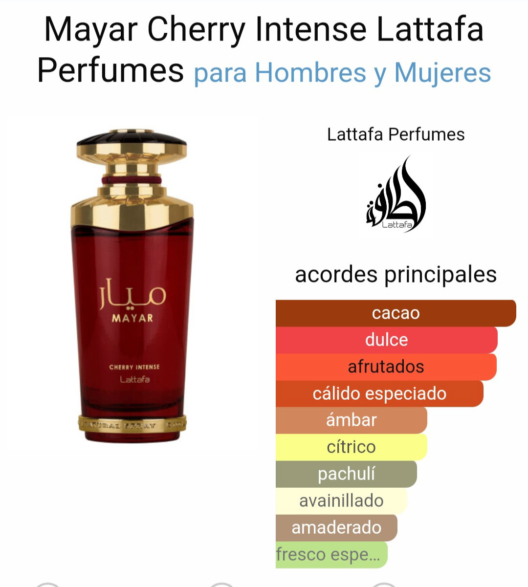 Mayar Cherry Intense de Lattafa Perfumes es una fragancia de la familia olfativa Oriental Vainilla para Hombres y Mujeres. Esta fragrancia es uno de los últimos lanzamientos de Lattafa de este 2024.