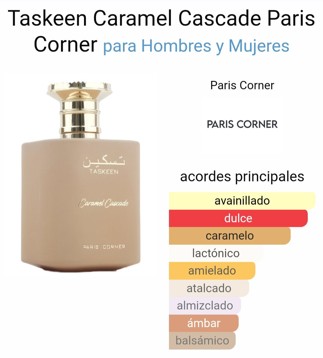 Taskeen Caramel Cascade de París Corner es una cautivadora fragancia unisex que combina dulzura y sofisticación en cada atomización.