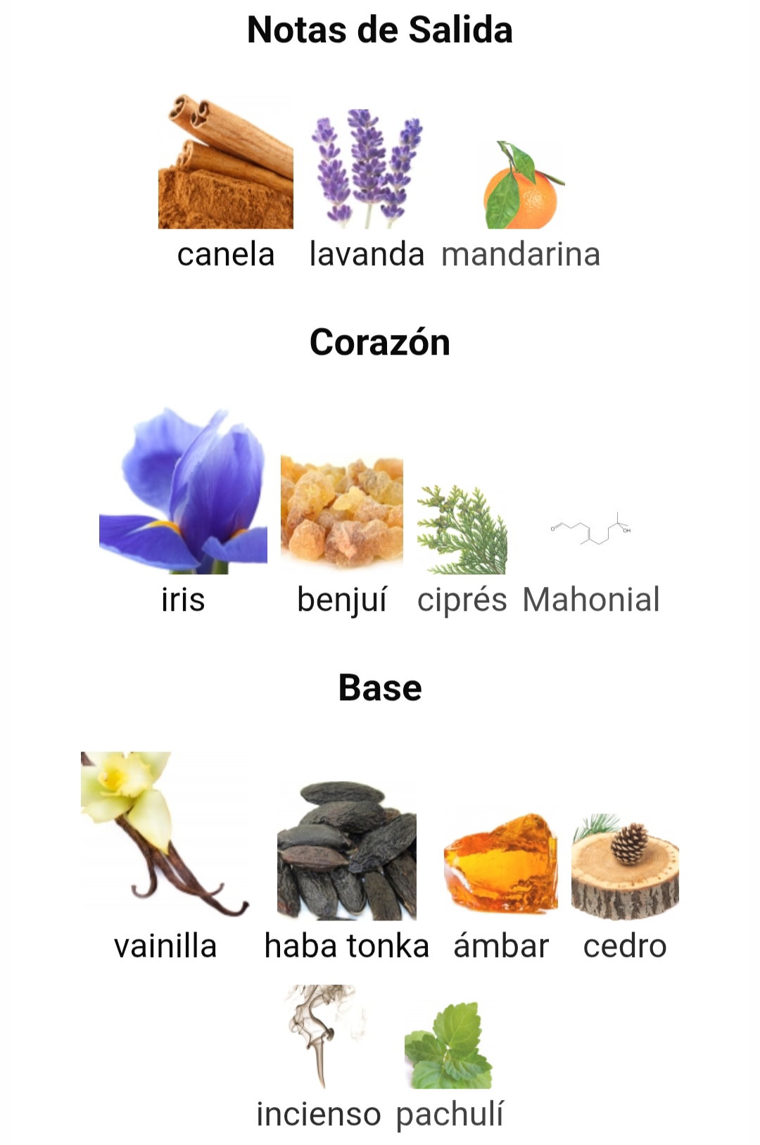 Notas medias: iris, ciprés, benjuí y mahonial