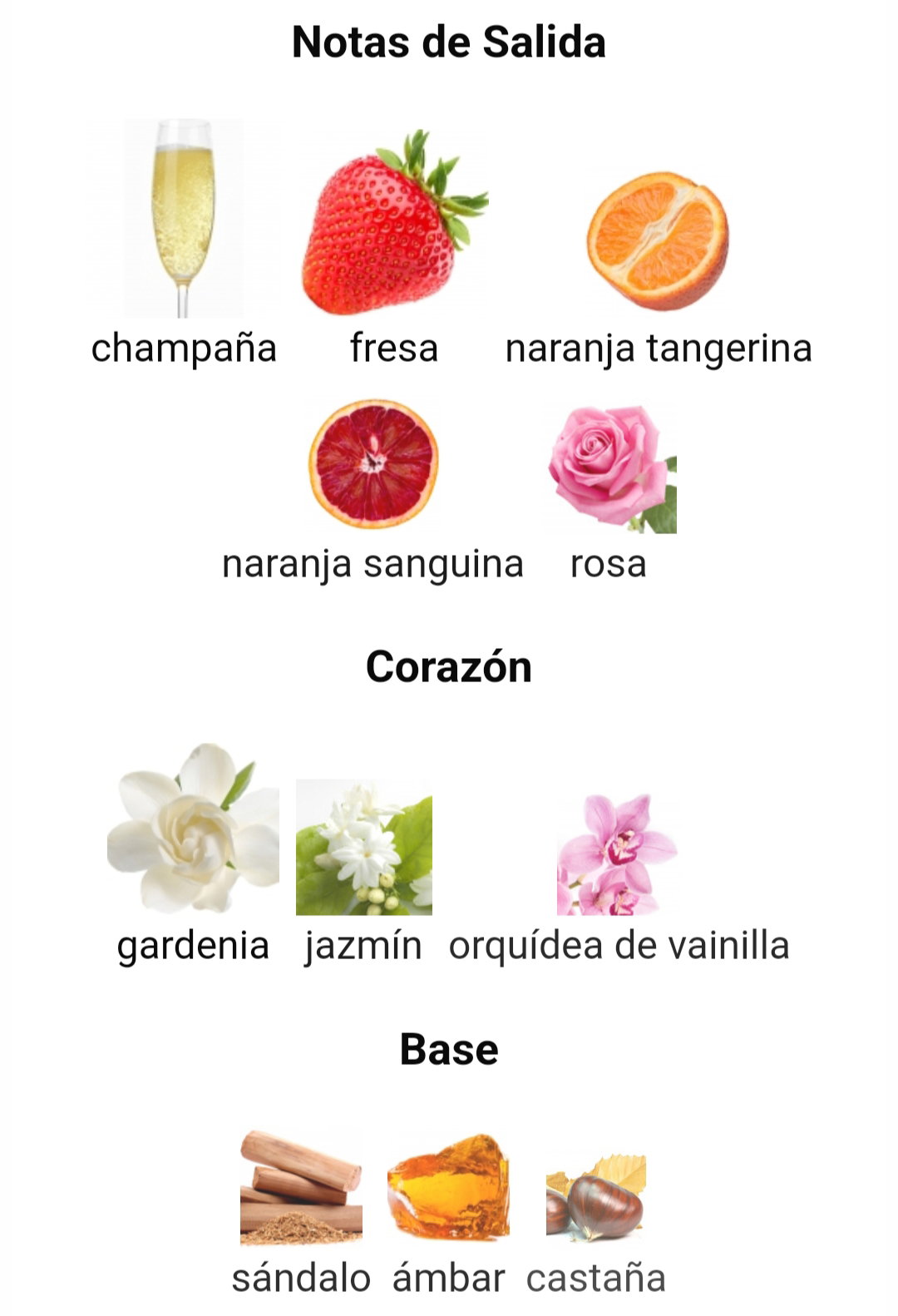 Notas de salida: Champaña, fresa, naranja tangerina, naranja sanguina y rosa