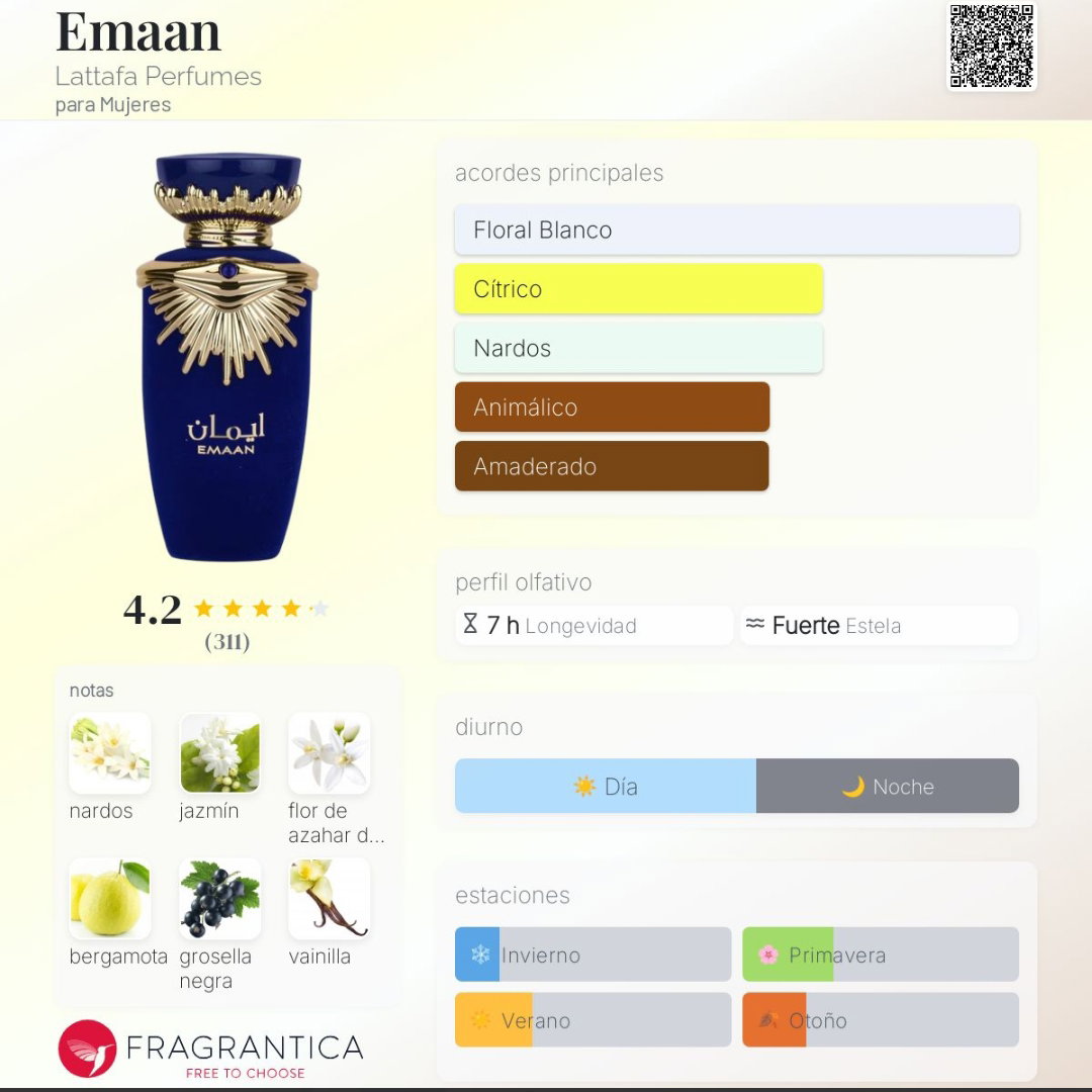 Emaan es una fragancia que proyecta confianza y un encanto inolvidable.