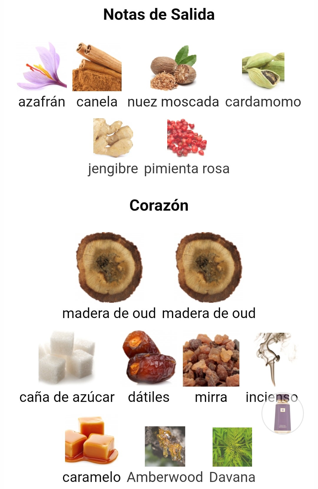 ✔️ Notas de Salida: azafrán, canela, nuez moscada, cardamomo, jengibre y pimienta rosa