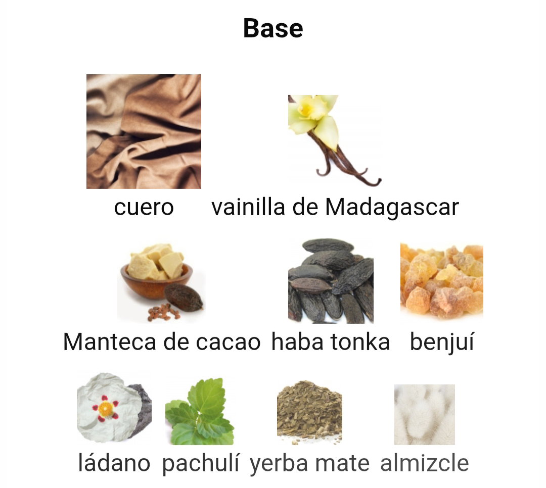 ✔️ Notas de Fondo: cuero, vainilla de Madagascar, Manteca de cacao, haba tonka, benjuí, ládano, pachulí, yerba mate y almizcle