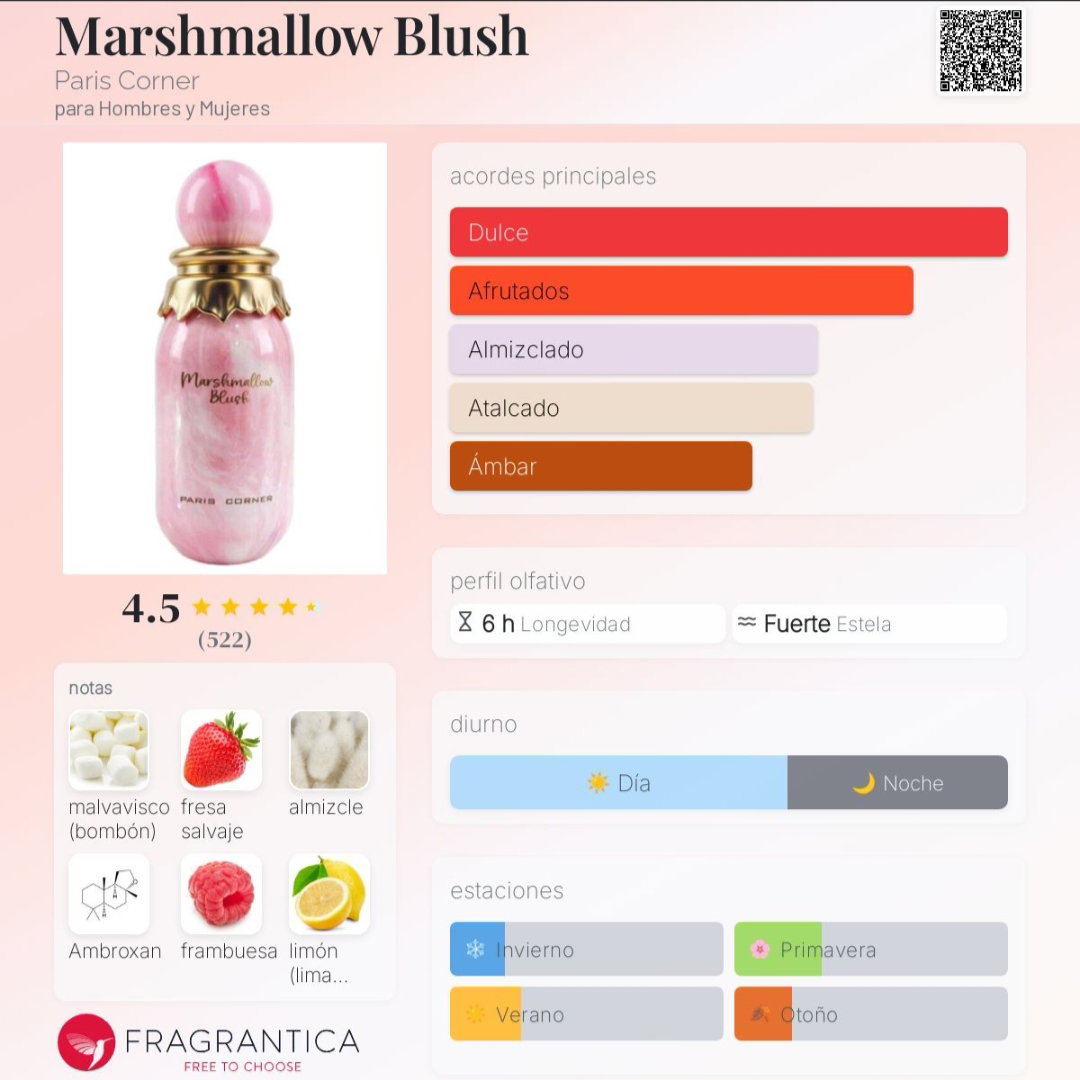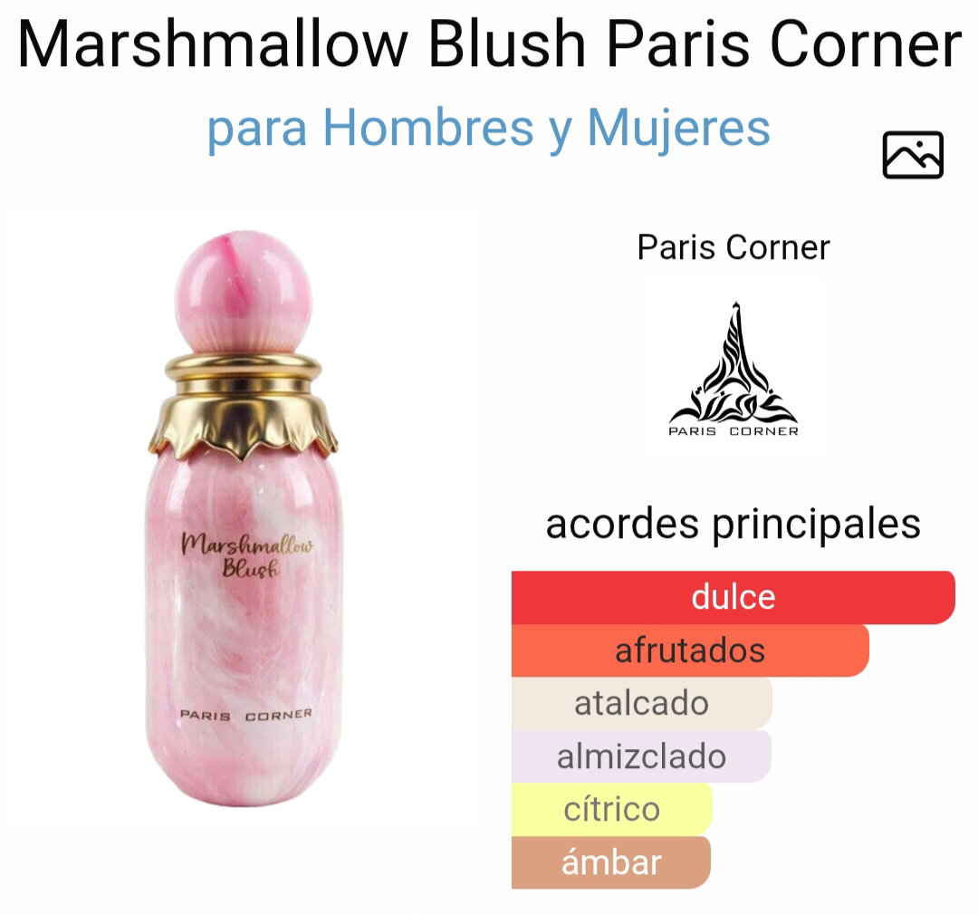 Marshmallow Blush de Paris Corner es una delicada y exquisita fragancia gourmand inspirada en Yum Boujee Marshamallow de Kayali.