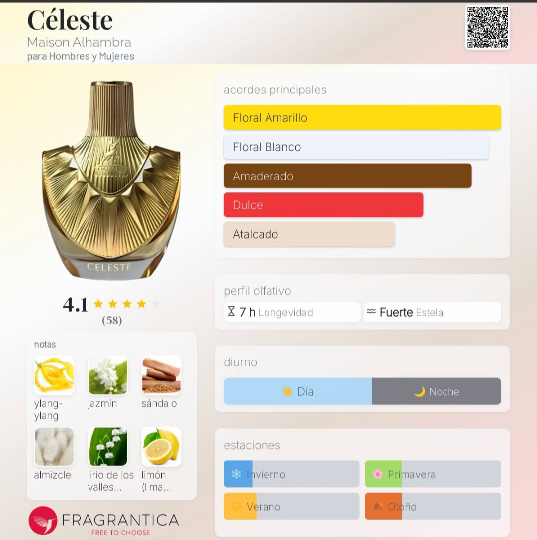 Celeste de Maison Alhambra es un exquisito Eau de Parfum diseñado para mujeres que ofrece una mezcla armoniosa de notas frescas, florales, saladas y cálidas.