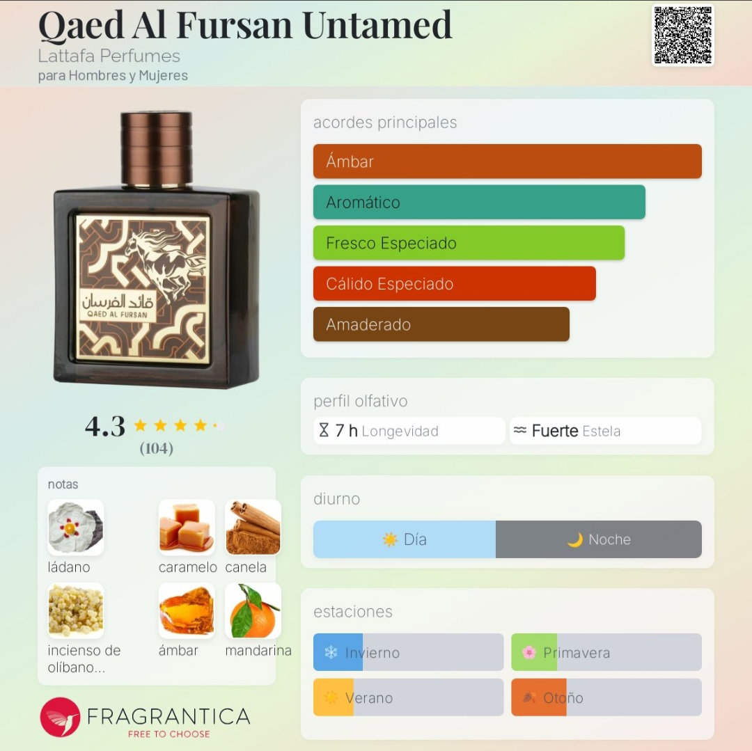 Qaed Al Fursan Untamed de Lattafa es una fragancia de la familia olfativa Amaderada Especiada para Hombres y Mujeres. Esta fragrancia es nueva. Inspirada en Eros Najim de Versace.