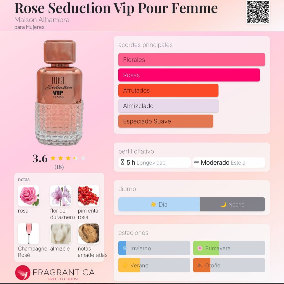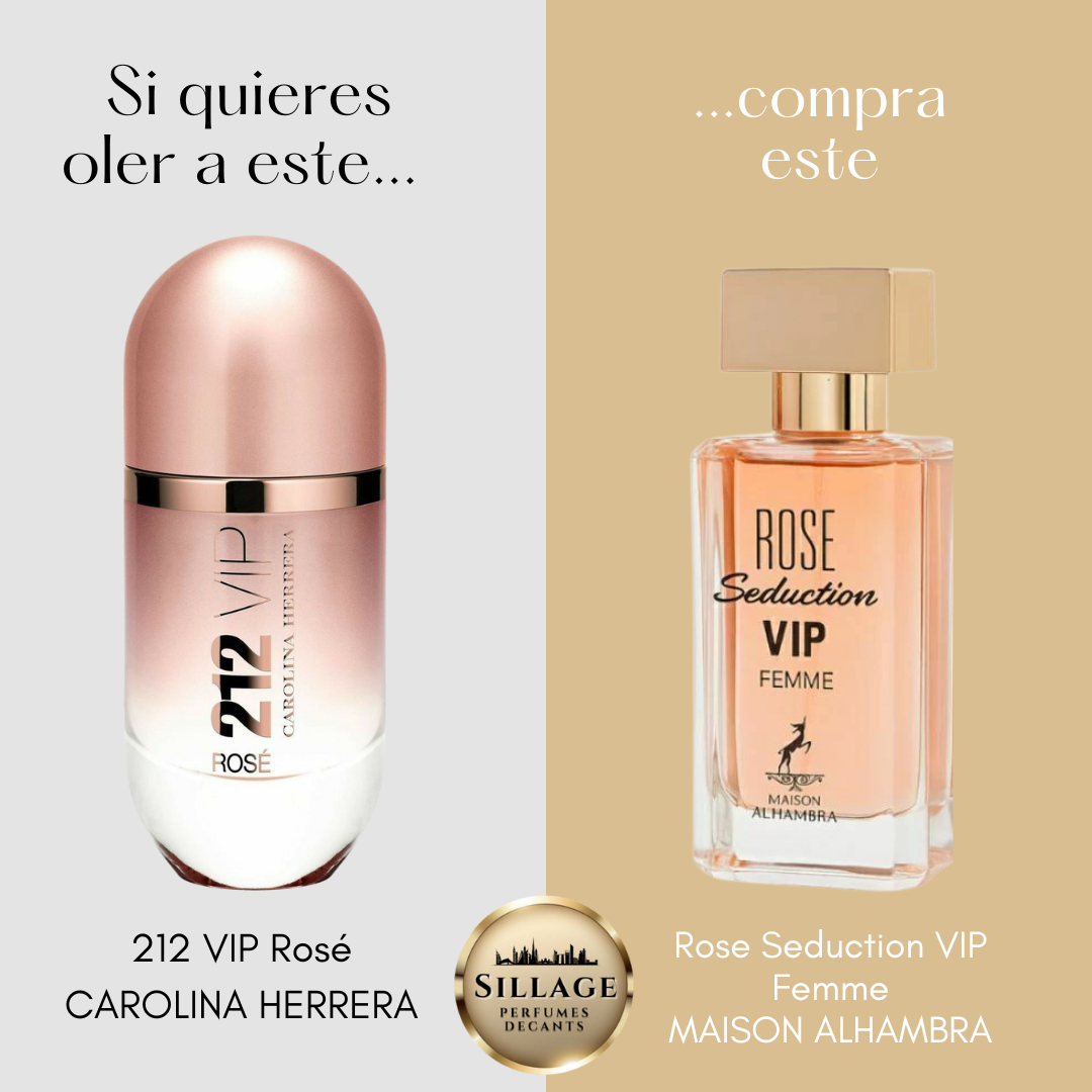 Rose Seduction Vip Pour Femme de Maison Alhambra es una fragancia de la familia olfativa Floral para Mujeres inspirada en 212 VIP Rose Seduction de Carolina Herrera.
