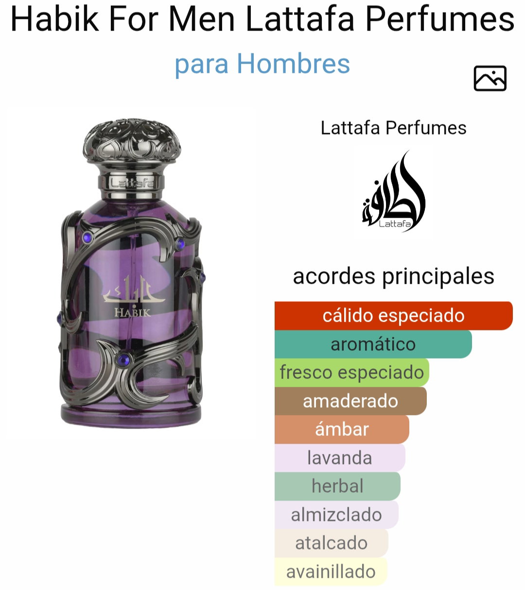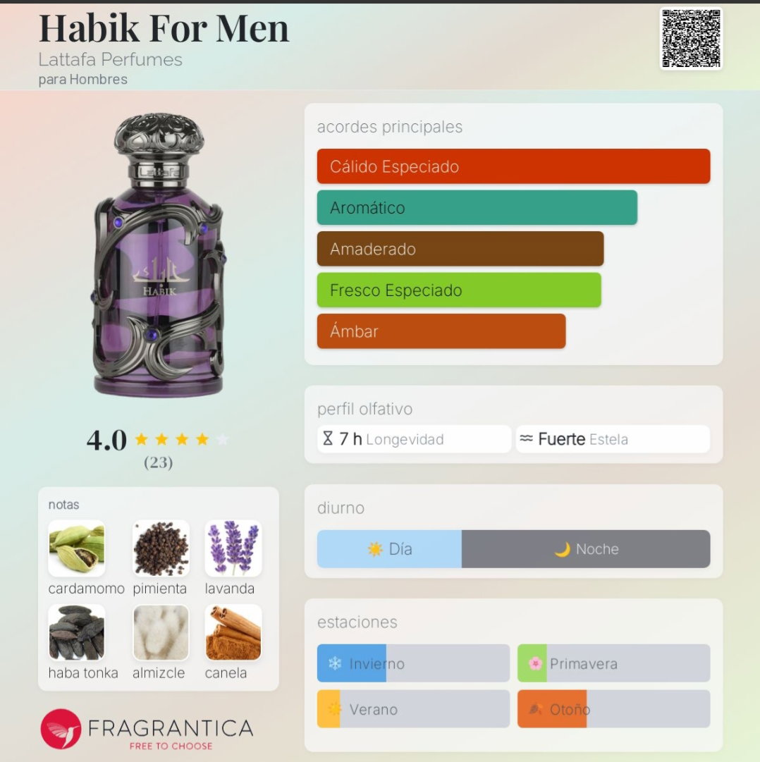 Habik for Men ofrece una experiencia aromática impactante, con una apertura con la vibrante especia del cardamomo y la pimienta, complementada con una fresca bergamota y un toque distintivo de artemisa. La fragancia se transforma en un corazón donde la relajante lavanda y la aromática salvia se realzan con la cálida y acogedora canela. Concluye con una robusta base de sándalo, pachulí, haba tonka, madera de ámbar y almizcle, creando una firma masculina rica y duradera.