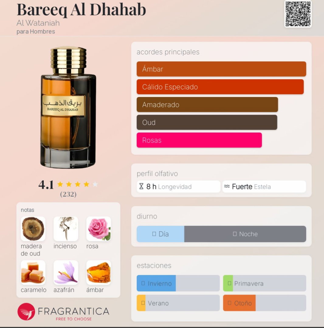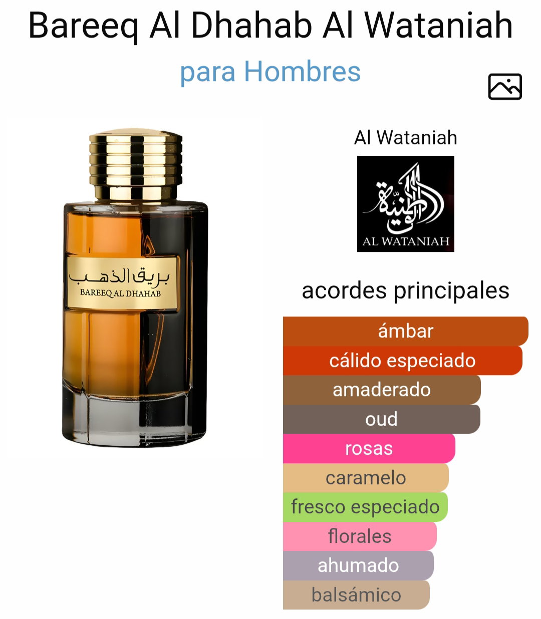 Bareeq Al Dhahab de Al Wataniah es una fragancia de la familia olfativa Oriental para Hombres. Se trata de un aroma floral, dulce y especiado clásico de la perfumería árabe.
