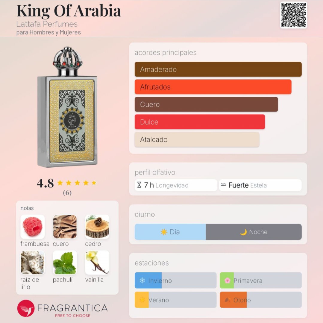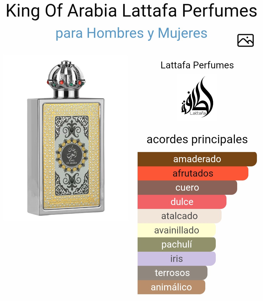 King Of Arabia de Lattafa Perfumes es una elegante fragancia de la familia olfativa Cuero para Hombres y Mujeres.