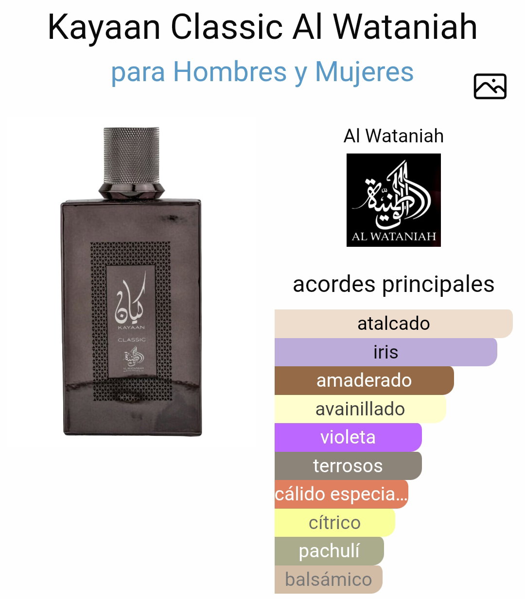Kayaan Classic de Al Wataniah es una fragancia de la familia olfativa Oriental Vainilla inspirada en la famosa Dior Homme Intense.