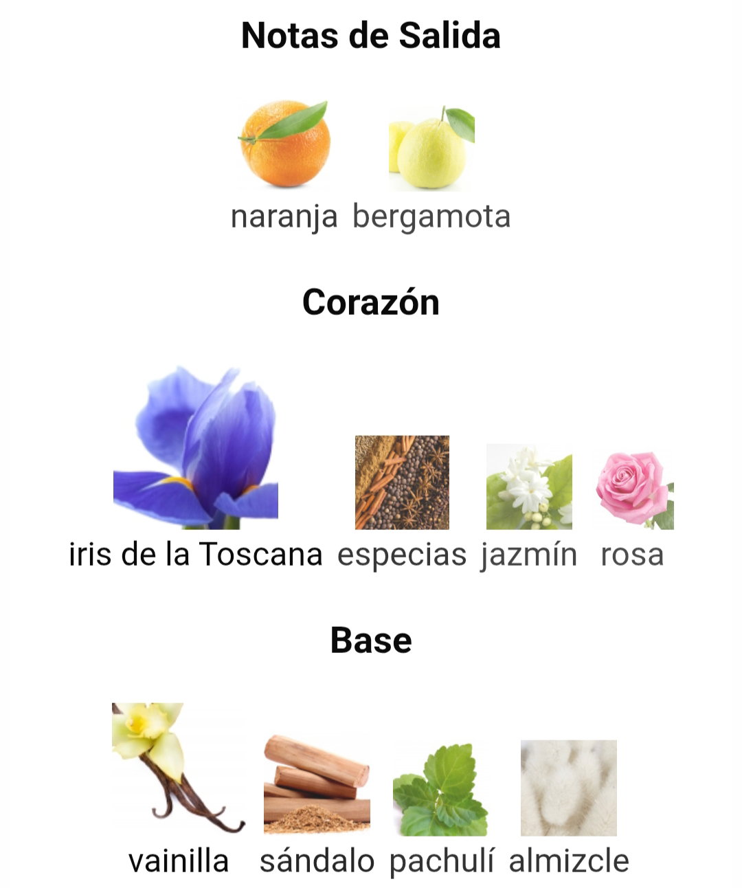 ✔️ Notas de Corazón: iris de la Toscana, especias, jazmín y rosa
