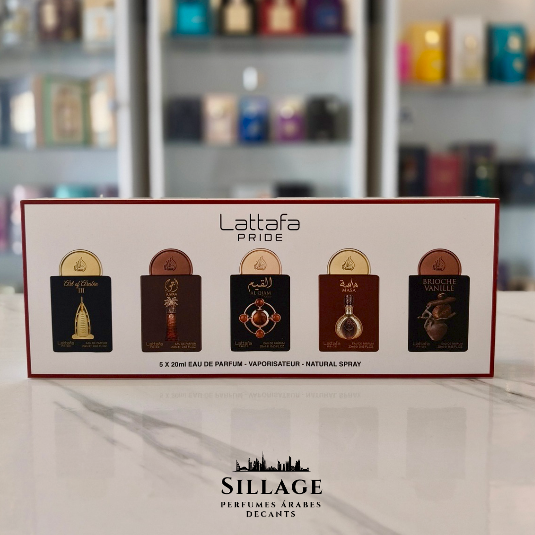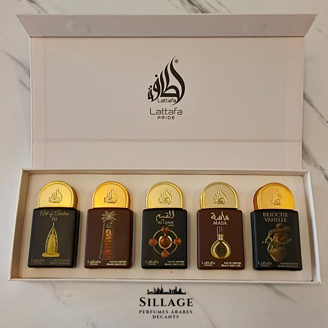 La BOX 4 incluye 5 mini tallas de la linea de LATTAFA PRIDE: