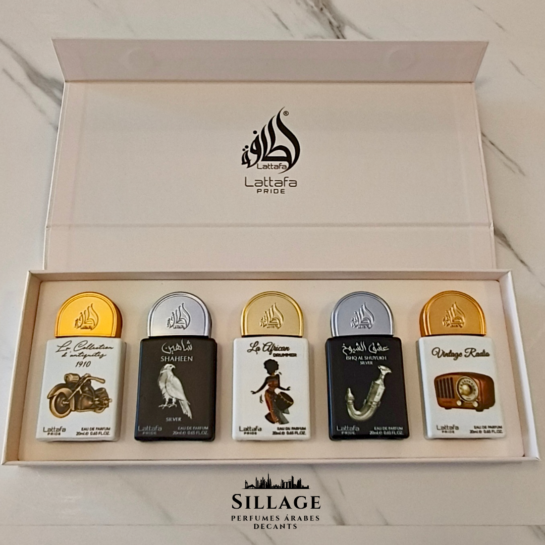 La BOX 5 incluye 5 mini tallas de la linea de LATTAFA PRIDE: