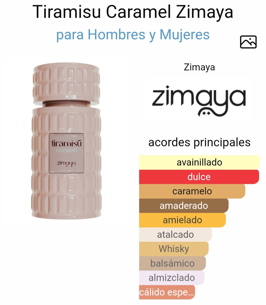 Tiramisu Caramel de Zimaya es una fragancia de la familia olfativa Oriental Vainilla inspirada en la super conocida Bianco Latte de Giardini di Toscana.