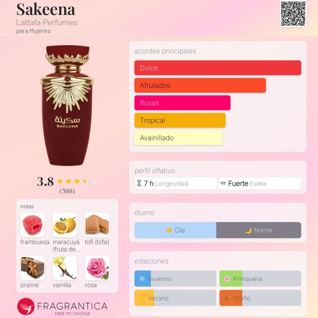 Sakeena de Lattafa Perfumes es una fragancia floral frutal gourmand para mujeres lanzada en 2022.