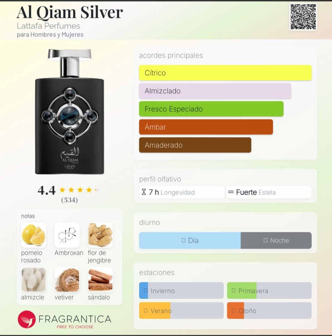 Al Quiam Silver de Lattafa es una fragancia masculina lanzada en 2022 que combina frescura, sofisticación y carácter. Inspirado en el exclusivo Tygar de Bvlgari, ofrece una experiencia olfativa intensa con un brillo propio.