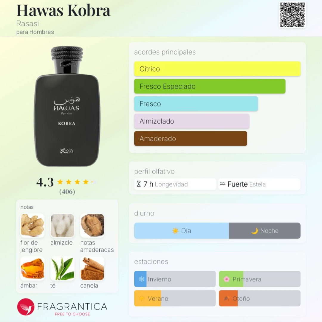 Hawas Kobra es un perfume oriental amaderado lanzado en 2025 para hombres, caracterizado por una apertura cítrica picante (jengibre, bergamota), un corazón especiado (canela, té verde) y un fondo amaderado y almizclado, que ofrece gran duración y proyección con un ADN similar a Imagination de Louis Vuitton pero más potente.