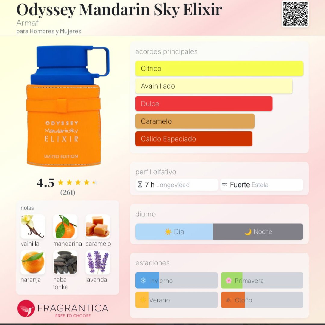 Odyssey Mandarin Sky Elixir es un perfume oriental amaderado que ofrece una evolución de la fragancia original Mandarin Sky, siendo más madura y con más carácter, introduciendo notas de lavanda, pimienta negra e incienso, junto a cítricos (mandarina, naranja) y notas dulces (caramelo, haba tonka), con una base duradera de vainilla y vetiver.