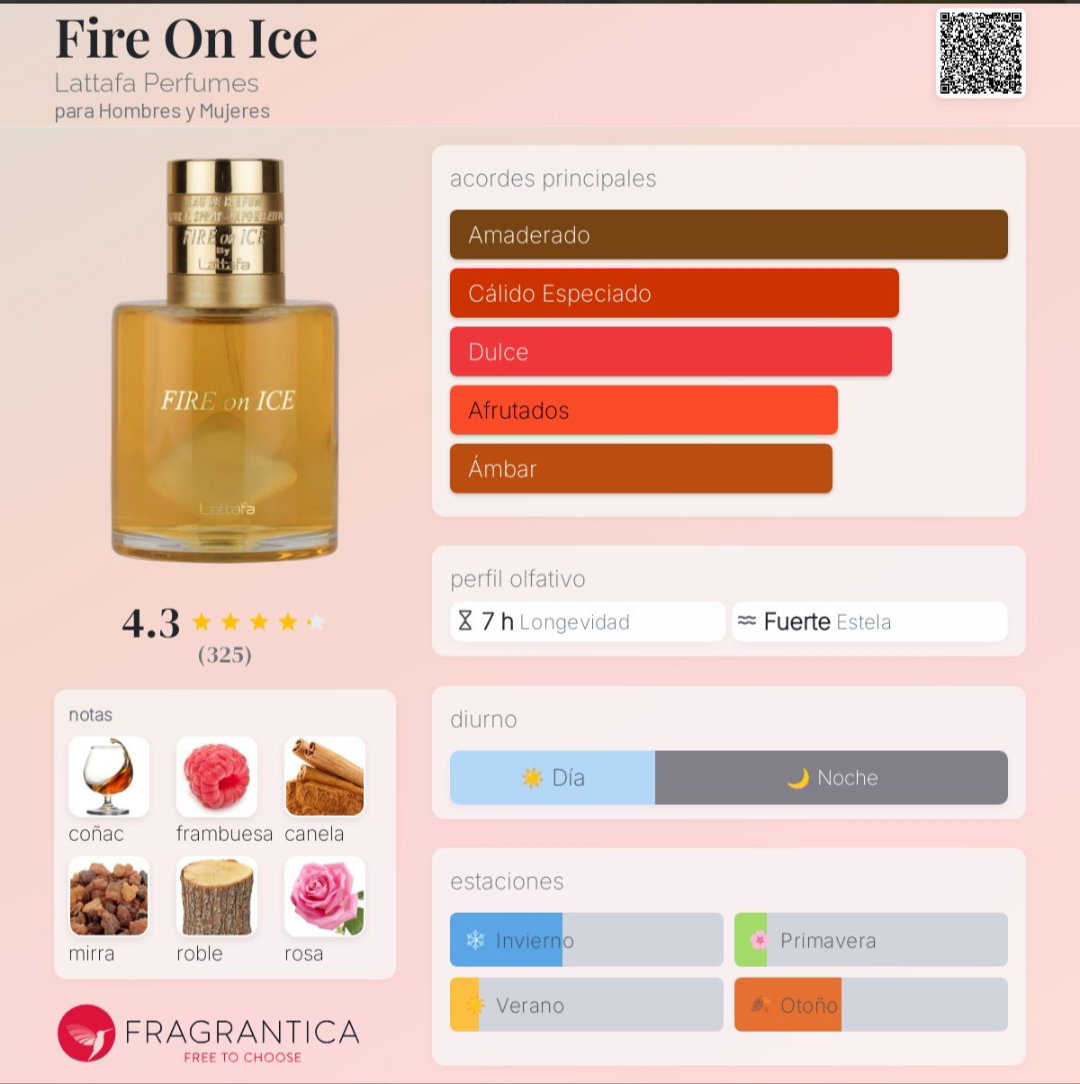 🔥🥃Fire On Ice es una fragancia oriental avainillada, unisex, que destaca por un audaz contraste entre notas cálidas y frescas, ideal para climas fríos u ocasiones nocturnas.