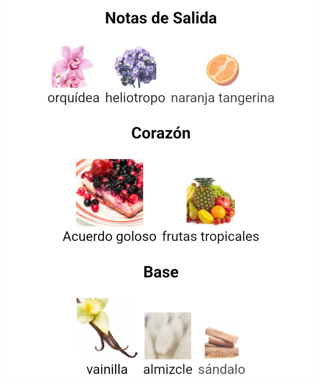 Esta fragancia comienza con notas de mandarina, orquídea y heliotropo.. El corazón está lleno de notas de frutas tropicales y acordes golosos, mientras que la base está llena de notas de almizcle, vainilla y sándalo.