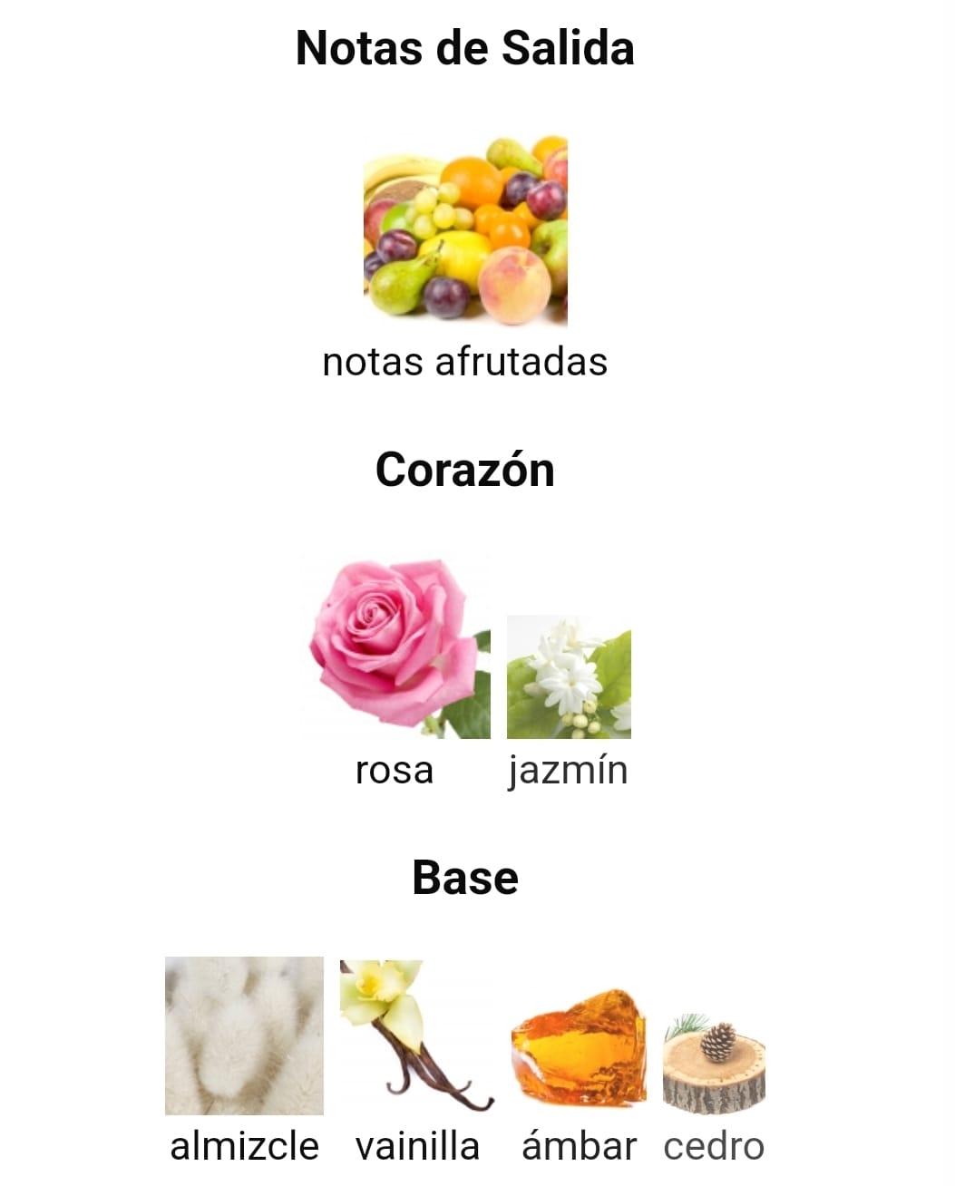 ❤️ Inicia con una explosión de notas afrutadas que dan vida a la composición. En el corazón, la elegancia floral de la rosa se entrelaza con la dulzura envolvente del jazmín, creando un bouquet inolvidable. Las notas de fondo de vainilla, almizcle, ámbar y cedro revelan una profundidad y calidez irresistibles, dejando una estela duradera que encantará los sentidos.