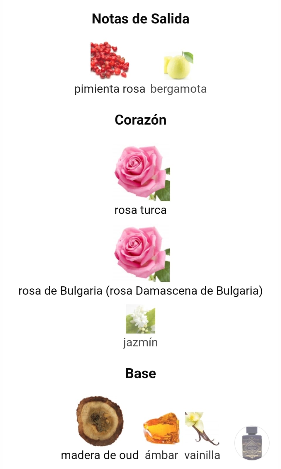 Notas de Corazón: rosa turca, rosa de Bulgaria (rosa Damascena de Bulgaria) y jazmín