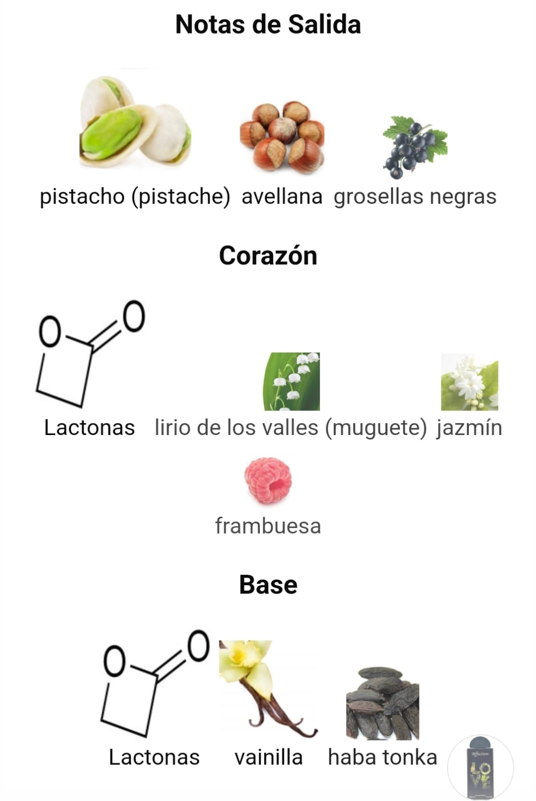 Las Notas de Corazón son Lactonas, lirio de los valles (muguete), jazmín y frambuesa