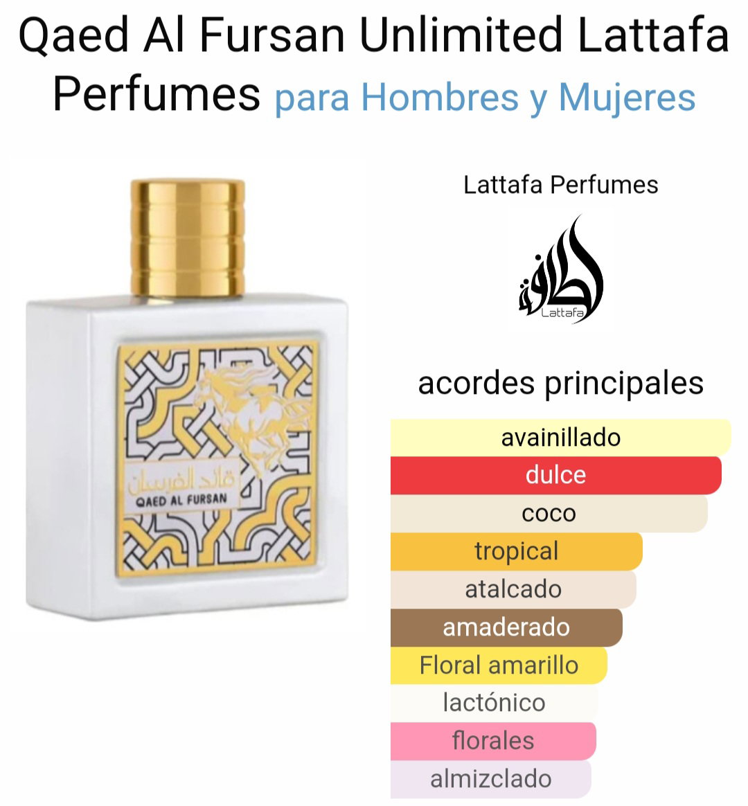 Qaed Al Fursan Unlimited de Lattafa es un viaje a un destino tropical paradisíaco, una fragancia unisex que evoca la libertad y la belleza de un oasis tropical.