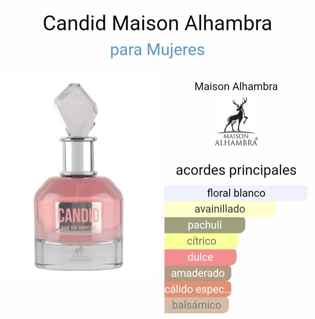 Candid de Maison Alhambra es una exquisita fragancia la familia olfativa Floral para Mujeres, conocida por ser una excelente inspiración del conocido Scandal de Jean Paul Gaultier.