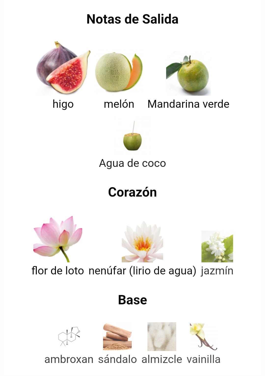 ✔️Su aroma es floral frutal con notas de vainilla, acuáticas y sándalo.