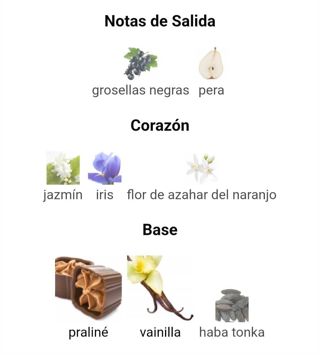✔️Las Notas de Salida son grosellas negras y pera; ✔️ Las Notas de Corazón son jazmín, iris y flor de azahar del naranjo