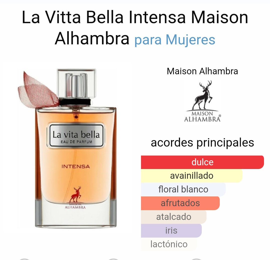 La Vita Bella Intensa de Maison Alhambra es una fragancia de la familia olfativa Floral para Mujeres.