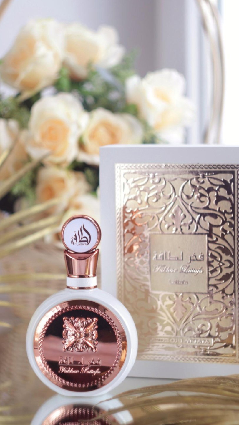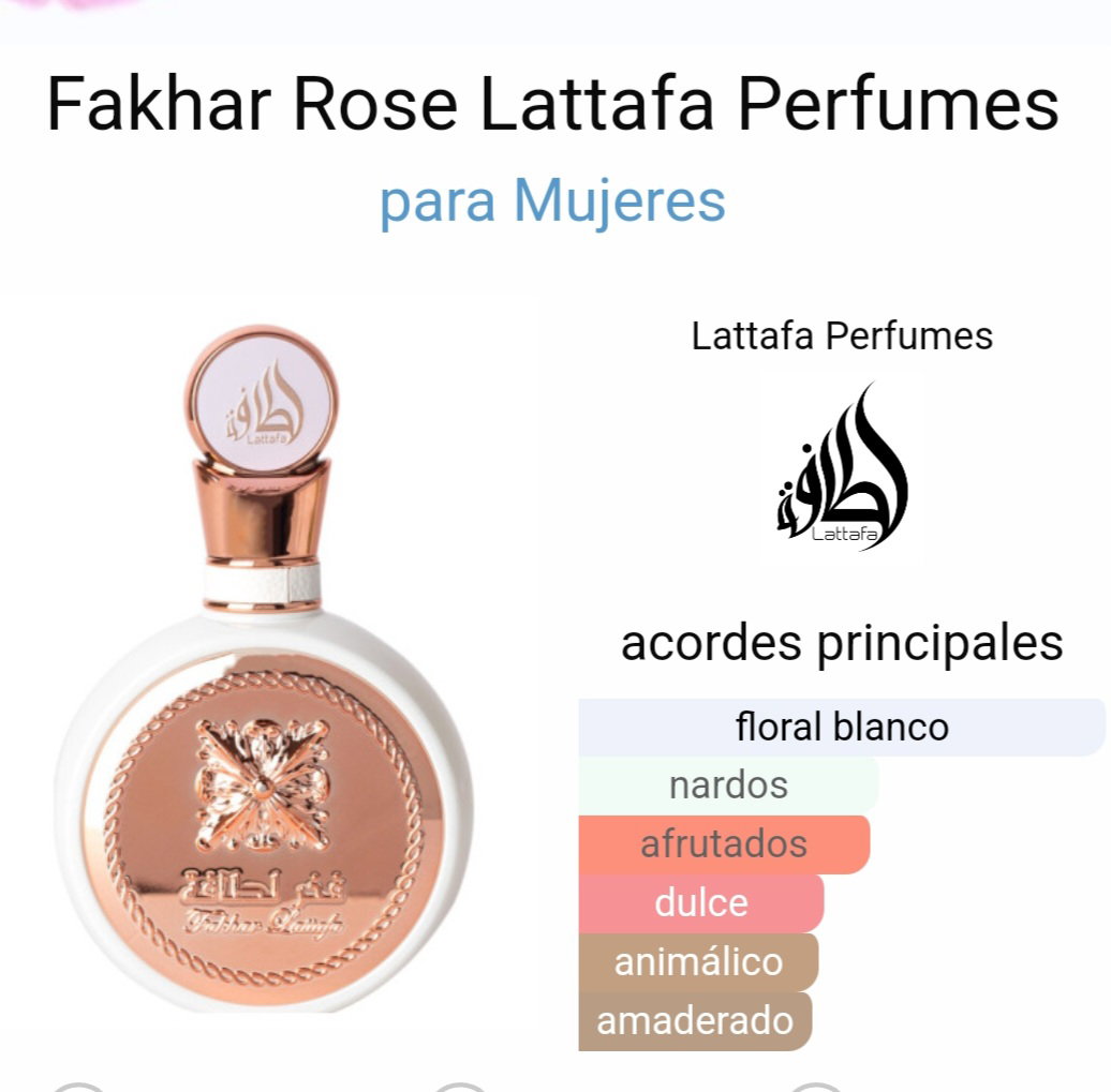 Fakhar Rose de Lattafa es una fragancia floral y encantadora que captura la esencia de la rosa en plena floración. Sus notas combinan la frescura de la rosa y las flores blancas con toques suaves de madera y ámbar, creando una experiencia olfativa única y sofisticada 💮⚘️🌸🌷