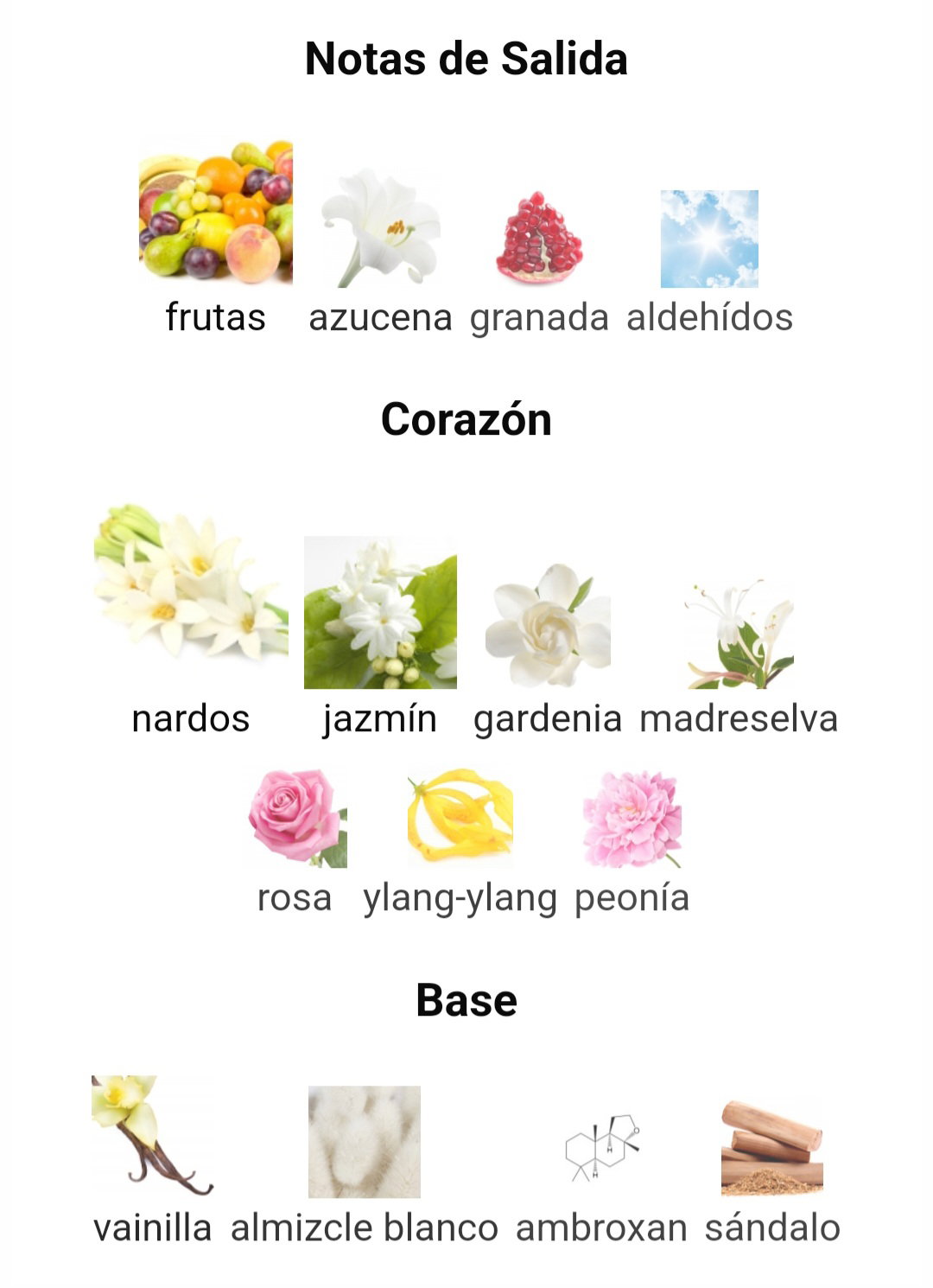 • Notas de fondo: vainilla, ambroxán, almizcle blanco y sándalo.