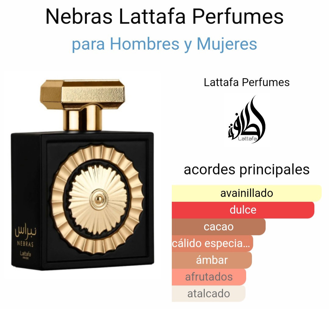 Nebras de Lattafa es una fragancia Gourmand oriental que combina una cálida vainilla con un delicioso cacao, acompañado por unas sensuales notas de rosa.