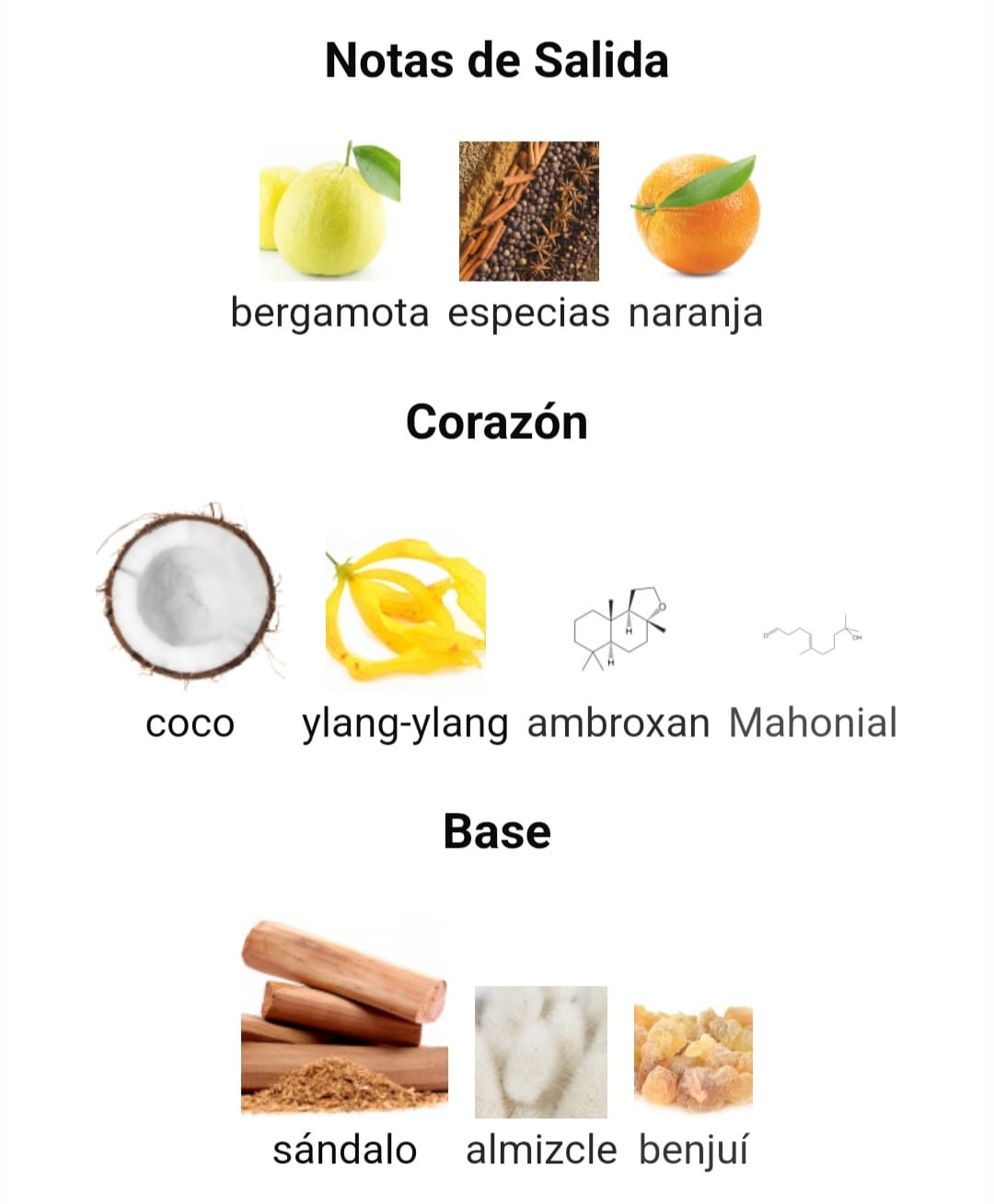 ✔️Notas de Corazón: coco, ylang-ylang, ambroxan y Mahonial🥥