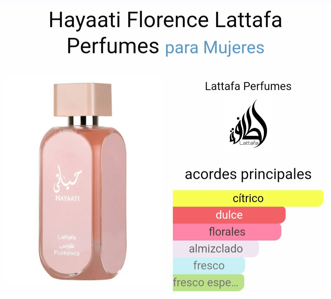 Hayaati Florence de Lattafa es una cautivadora fragancia de la familia olfativa Floral Frutal Gourmand para Mujeres. ✨️🌸