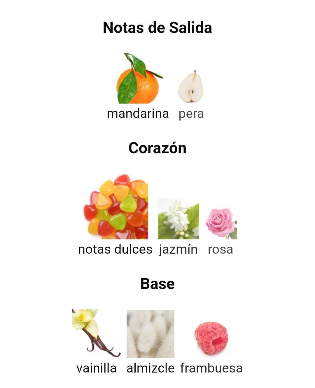 ✔️ Notas de Corazón: notas dulces, jazmín y rosa ✔️ Notas de Fondo: vainilla, almizcle y frambuesa.
