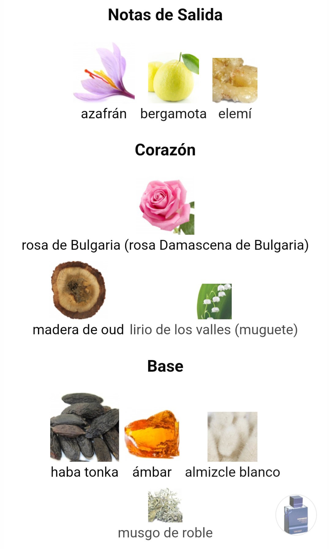 ✔️ Notas de Corazón: rosa de Bulgaria (rosa Damascena de Bulgaria), madera de oud y lirio de los valles (muguete)
