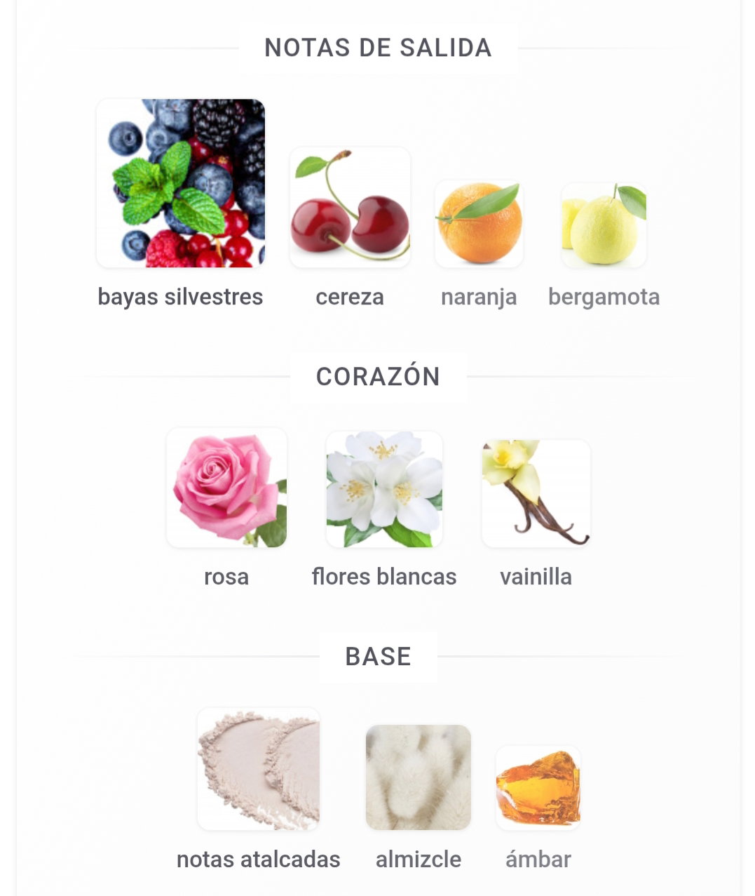 • Notas de Salida: Cereza, bayas silvestres, naranja y bergamota.